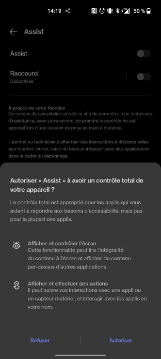 - Sur Android uniquement, acceptation éventuelle du service d’accessibilité pour permettre un contrôle à distance complet.